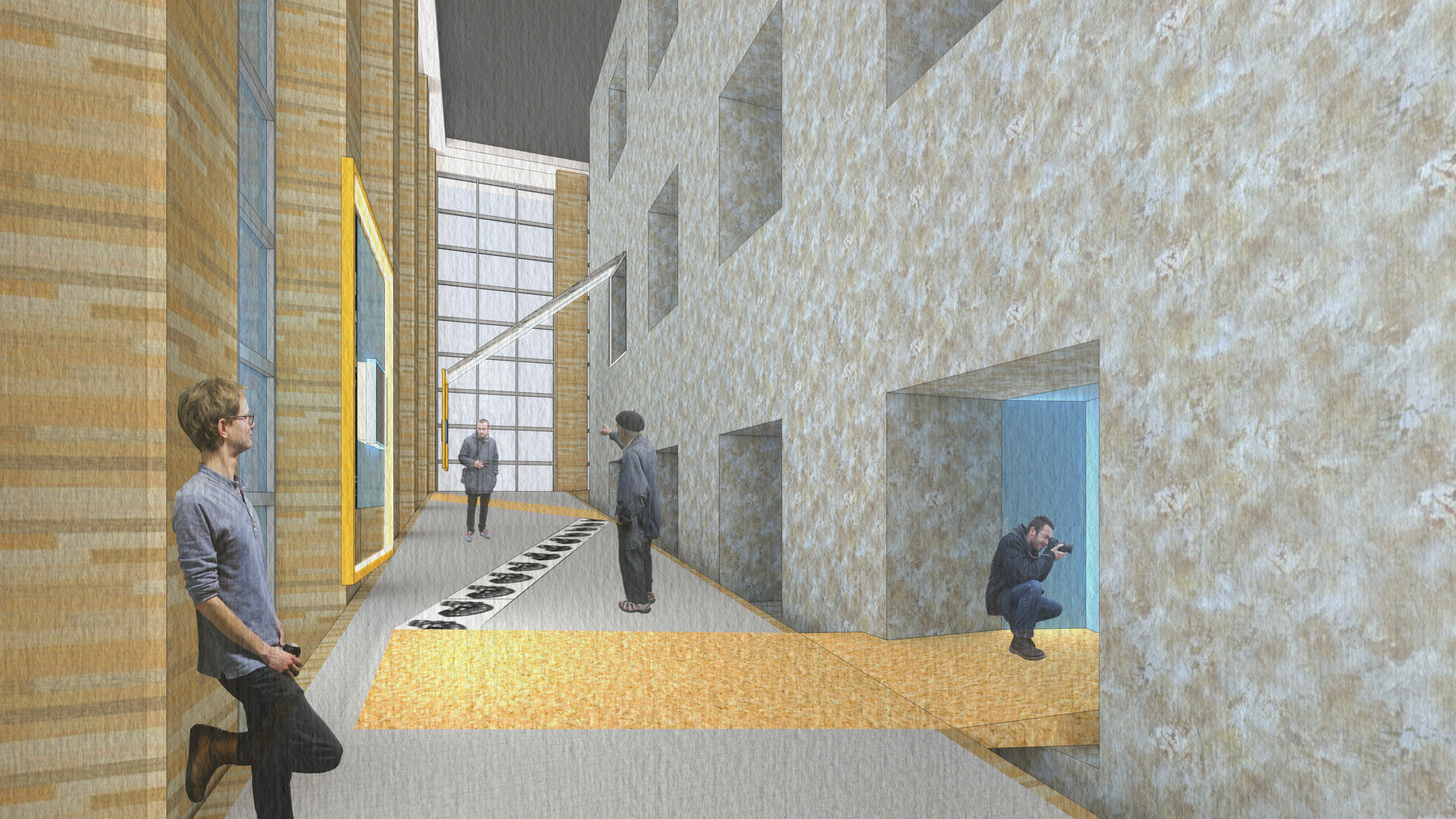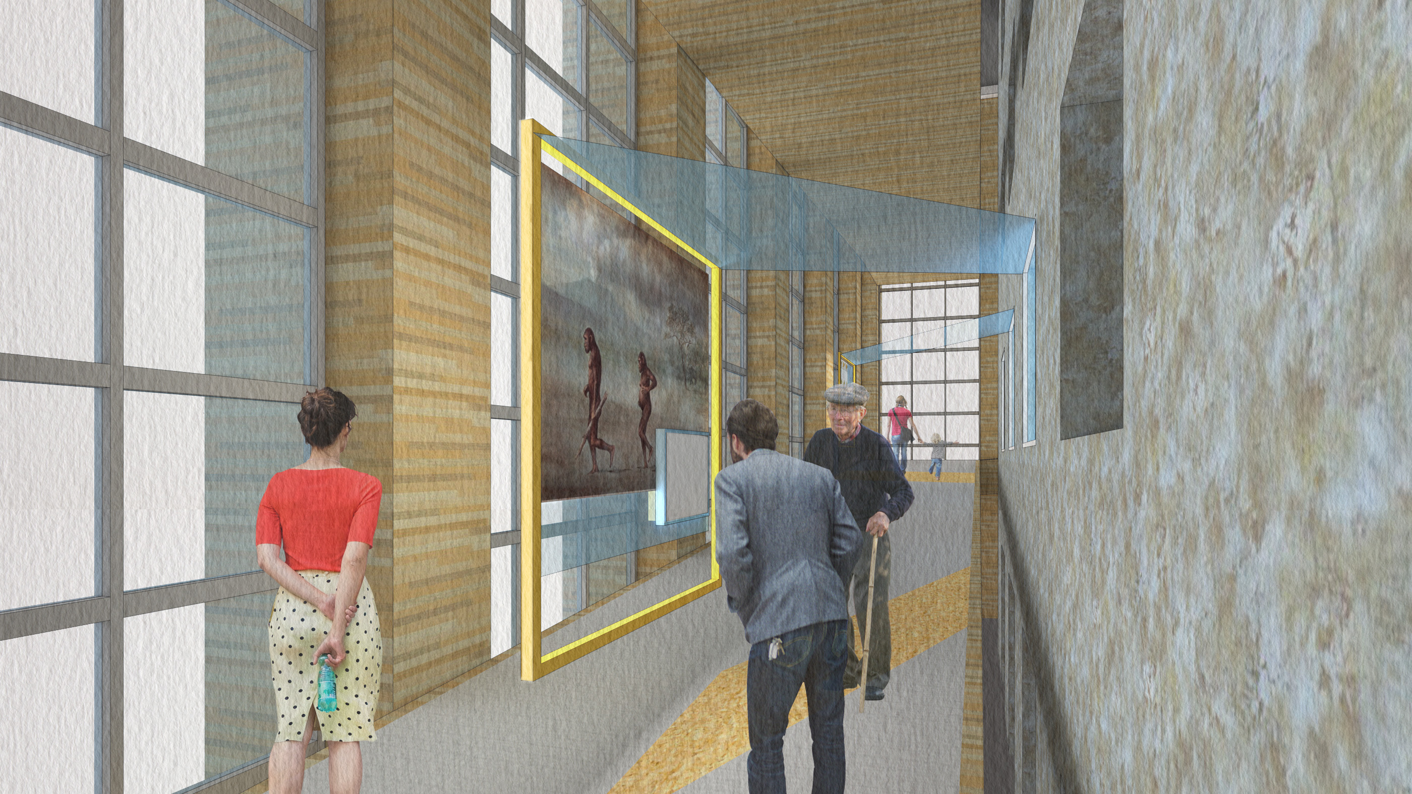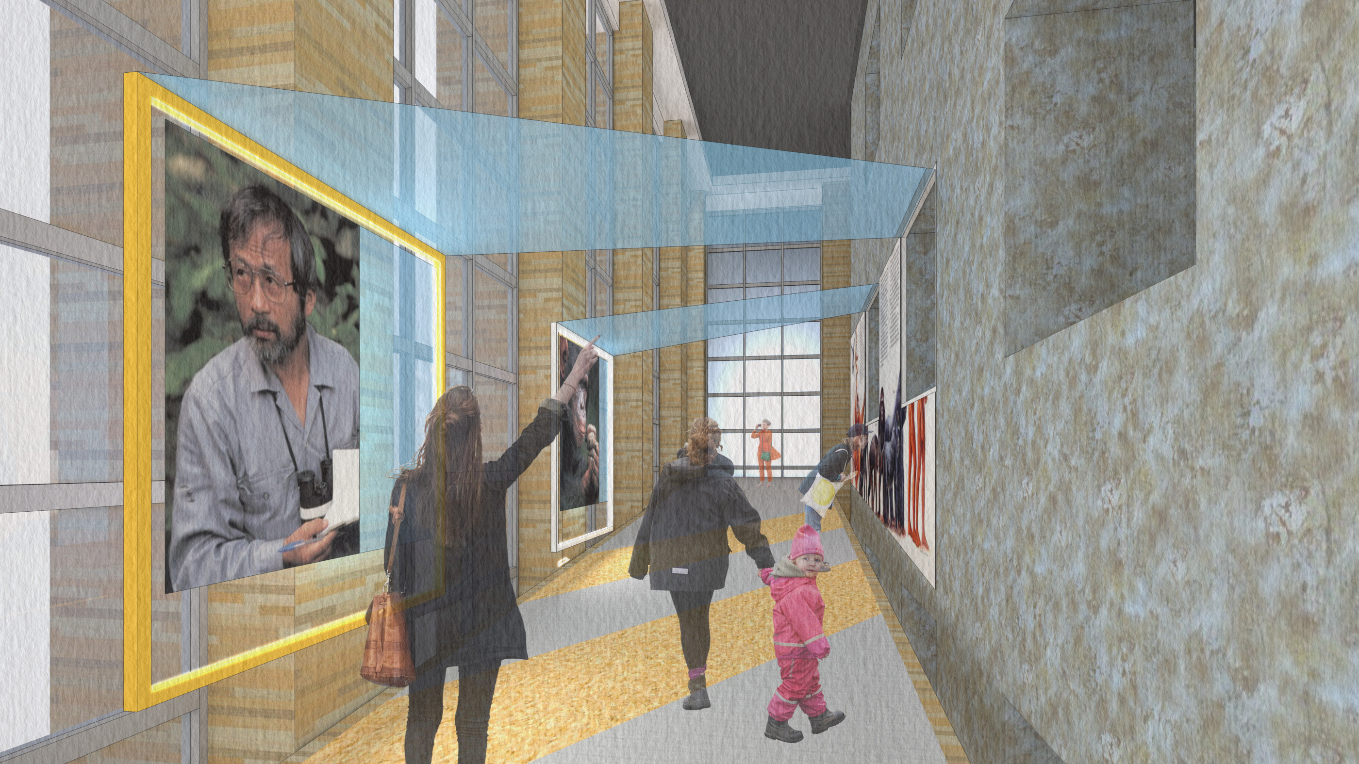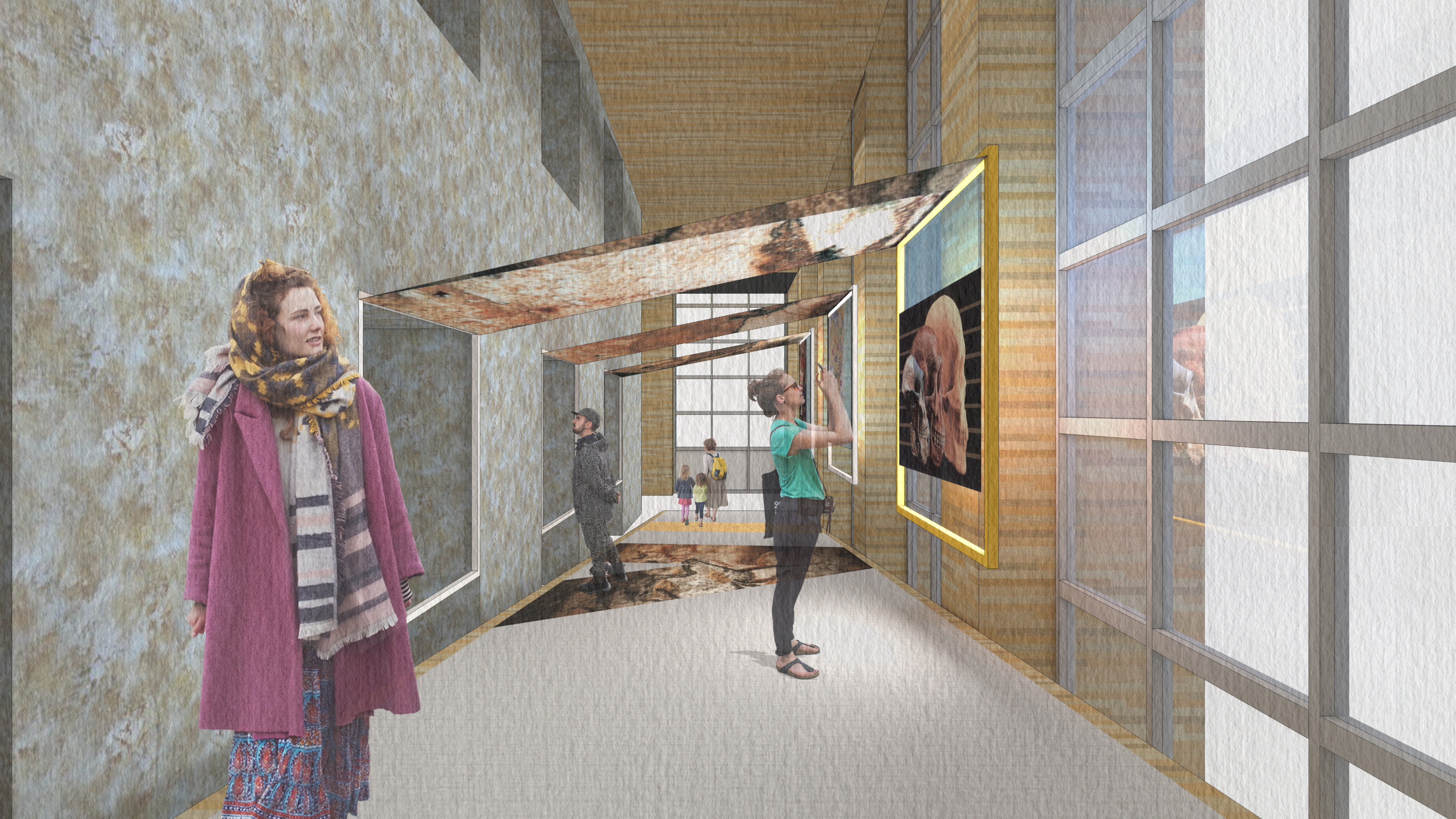 達爾文進化論提出物競天擇的過程,「適應自然者則生存,不適者淘汰」述說著人類的演化故事,從過去、現在到未來,亦或是從自然史到文明史,在台灣史前文化博物館既有的空間中呈現了一個時間軸的轉變,觀者透過空間循序進地了解自己如何成為這位演化故事下的幸運者。羅馬競技場形式的空間序列,設定為時間演化軸的坡道,地坪一段又一段的以Shift方式的分割,以及展示面板上方與地坪相襯的玻璃,皆依回字型圍繞著中庭,古典元素的窗洞與牆面結合產生「虛」與「實」,光線從中隨機穿透且不斷曲折向上,使路徑充滿著探險的氛圍,人遊走於其中,彷彿被引導著穿越時空。