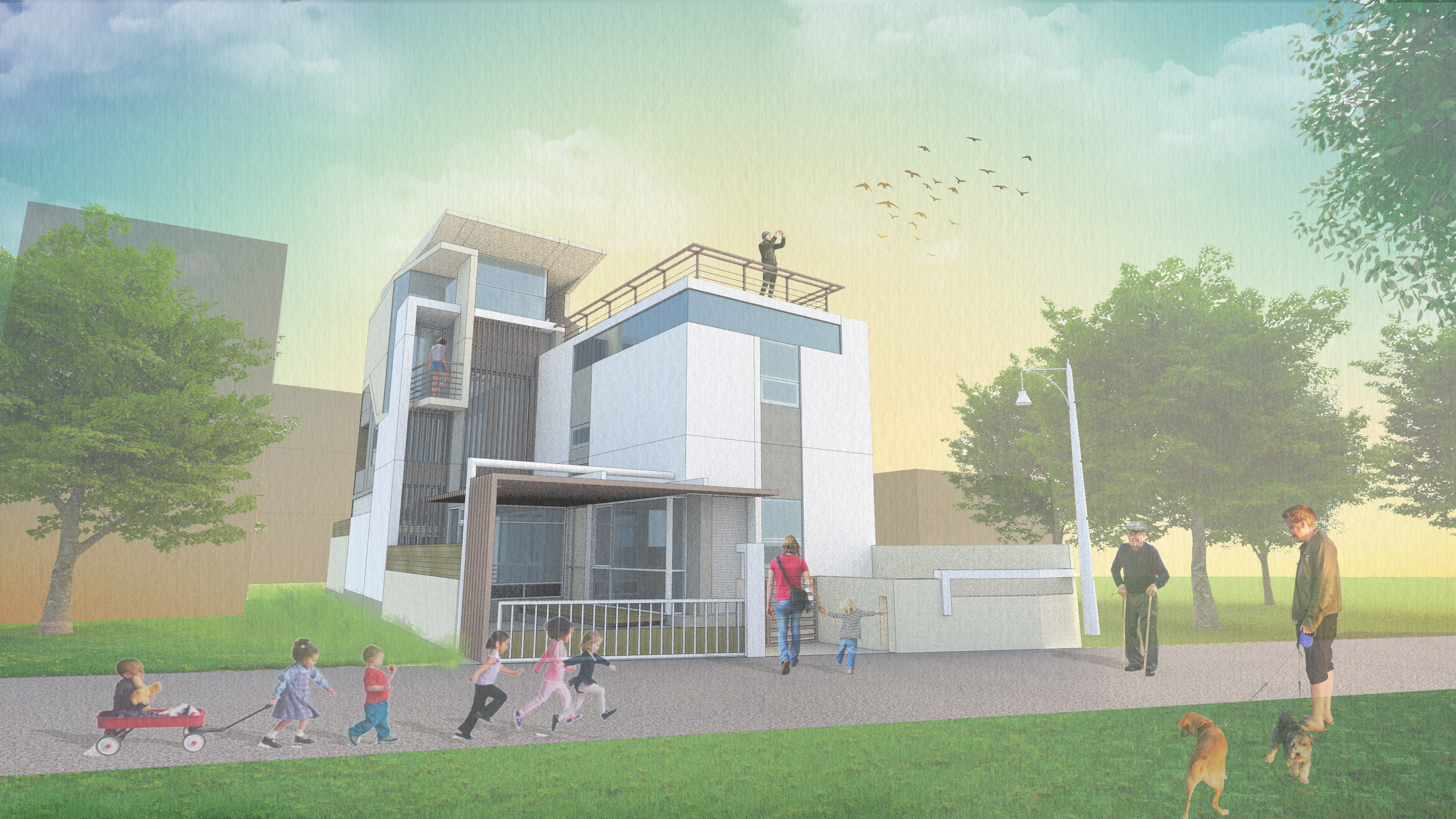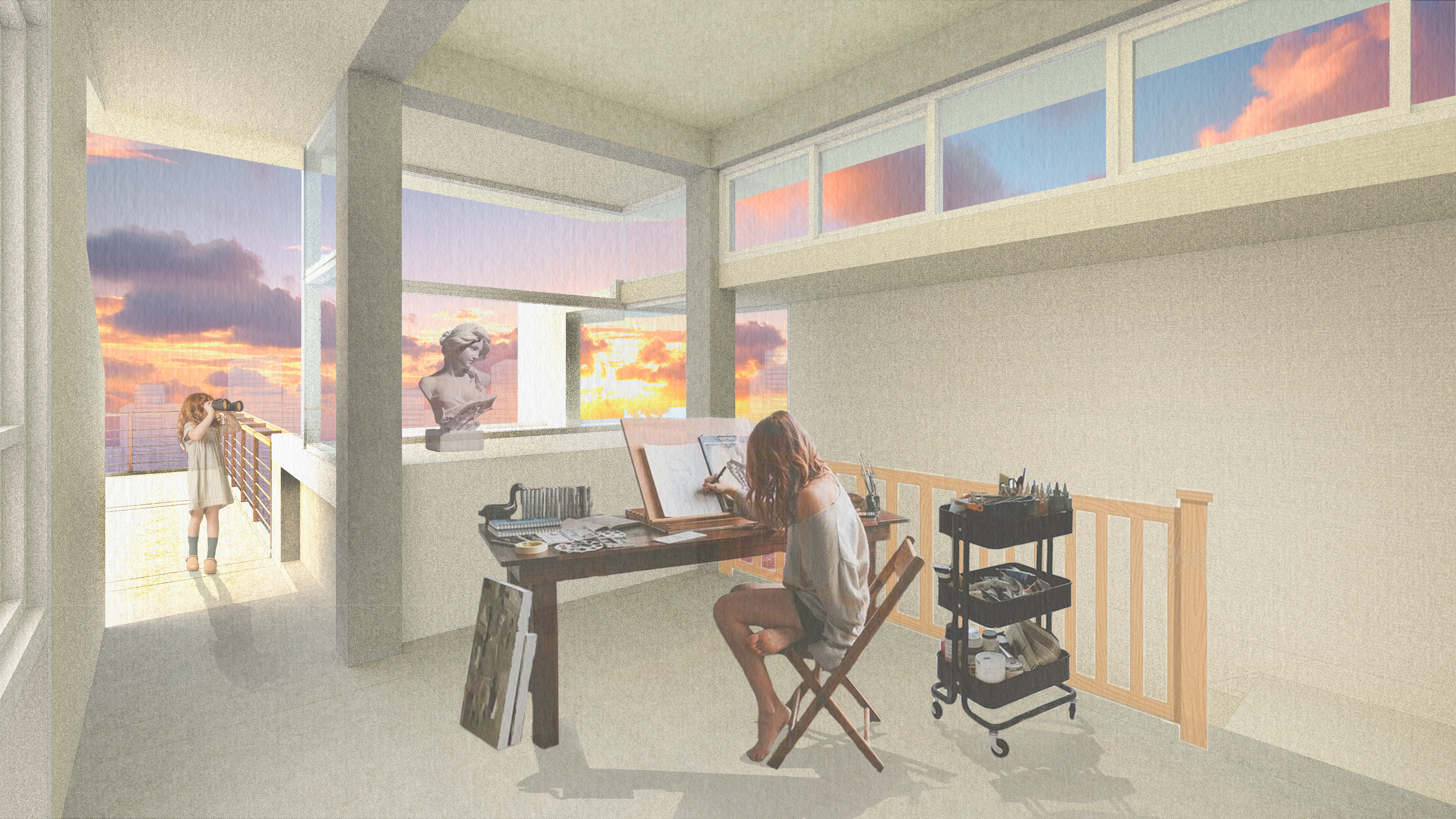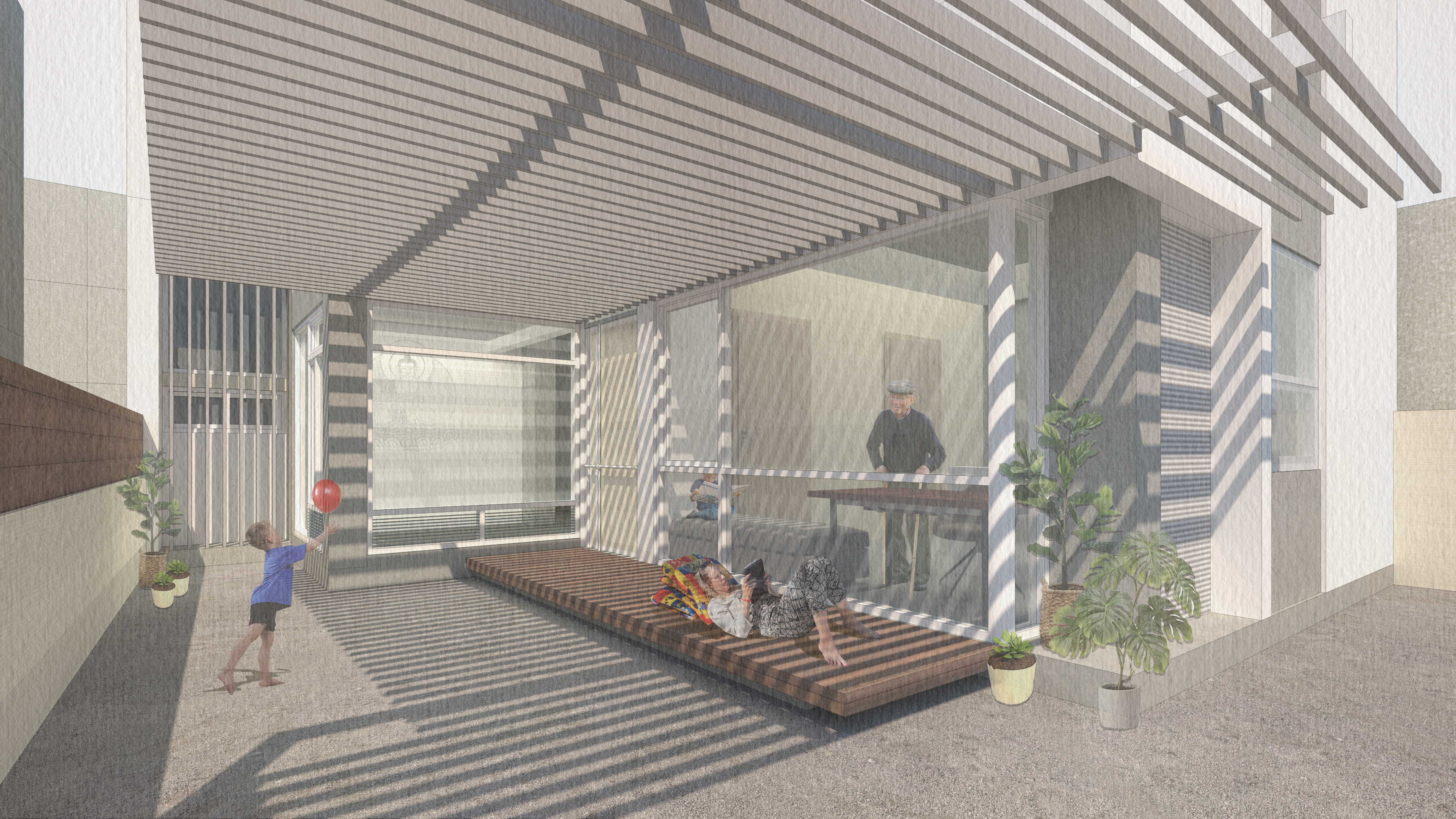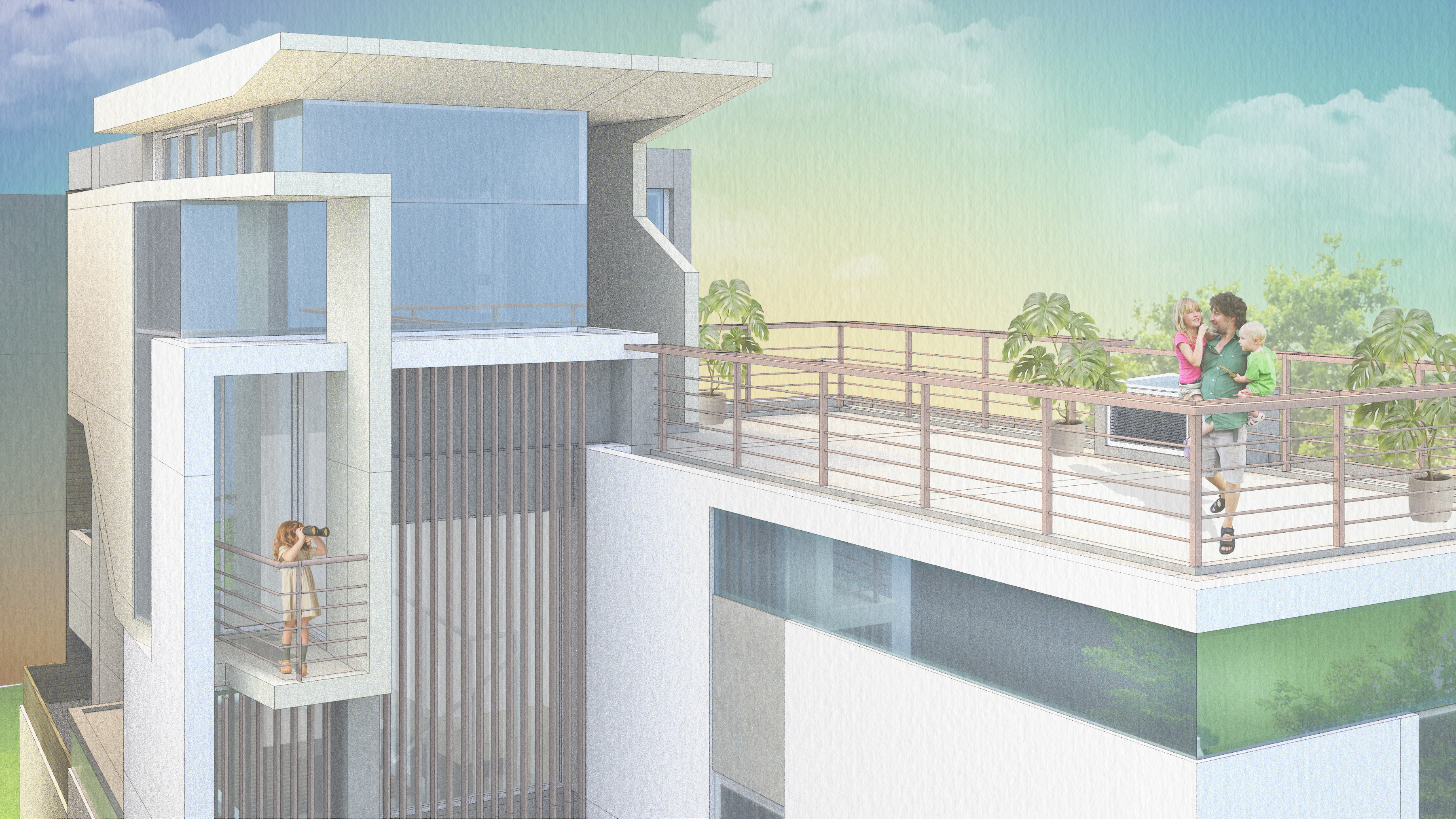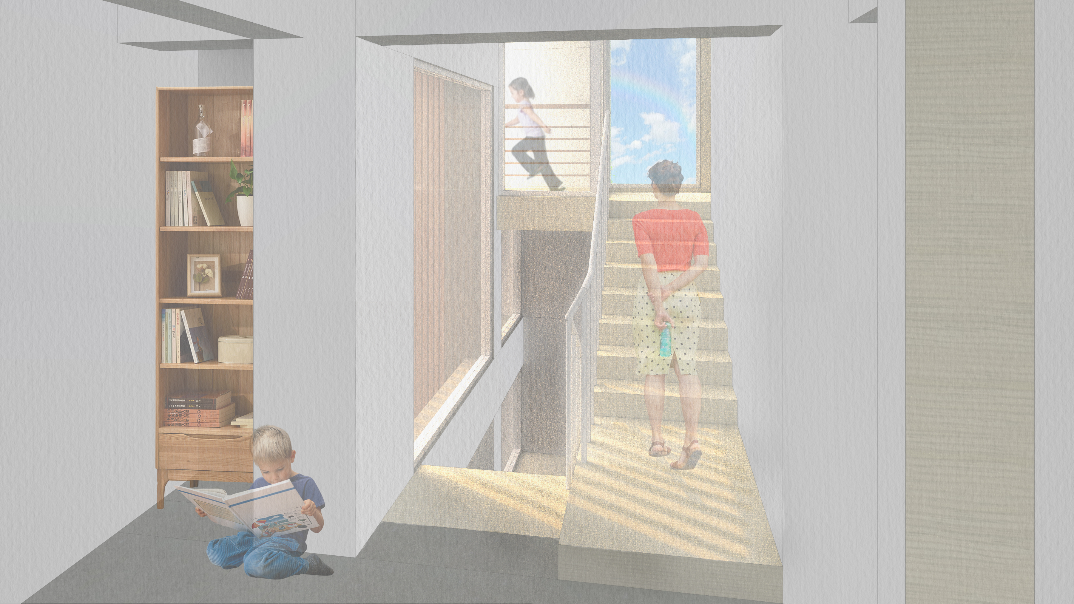 大家眼中的業主陳大哥總是願意給予許多的愛與付出,而他也一向願意把最好的留給家人。 「阿公個性瀟灑,喜歡到外面走走,所以房間要在一樓以便能隨時出門;阿嬤有禮佛的習慣所以要有一間佛堂;太太想要最舒適的空間加上一張雙人床,兒子到了需要有隱私的年紀,但房間需要採光;女兒只需要個安靜的作畫空間,最後給我一張床就夠了。」陳大哥這麼說著。 敞開庭院大門,阿公的房間便在一旁,透過大面積開窗從室內往外一看,印入眼簾的一抹綠讓人好似身處戶外,還有扇專屬門直通家門外,滿足說走就走的習慣,獨立浴廁在天井光線投射的氛圍中老伴聊天,阿嬤的房間與佛堂有著充足的陽光與新鮮的空氣,讓她在與祂最近的距離虔誠地參拜。在街屋林立的城市裡陽光有如稀世珍寶,在有限的開窗面向下,我們不放過任何與光接觸的機會,客廳與餐廳前的退縮形成內庭,窗外的景色伴隨家人間的談笑聲。沿著樓梯而上,臥房的高水平窗帶形成立面的延續之外,還兼具通風、採光及隱蔽,樓梯間的突出使室內更寬敞,形成的陽台,站在這便能將家的模樣盡收眼底,一座樓梯將空間屬性劃分,女孩可以在寧靜的畫室中沉浸地揮舞畫筆,屋頂平台欄杆的退縮減少了高帶來的恐懼外,同時也為建築增添層次。 要是你問博大無私的愛是什麼?答案能就是陳大哥與這棟建築帶給我們的感受吧。