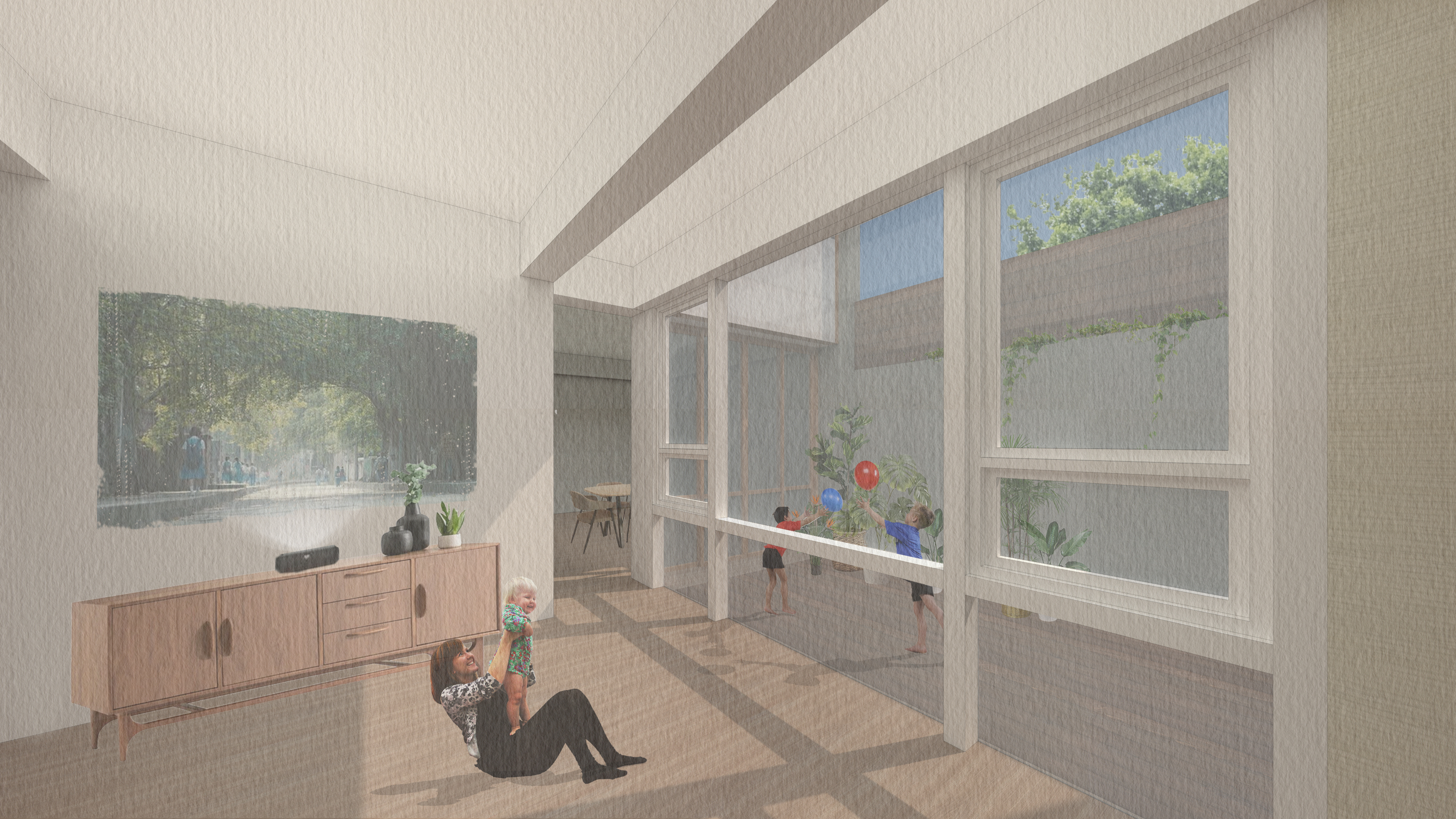 The owner of the house, Mr. Chen, has always given the best to his family. This is how the owner, Mr. Chen, is seen by all the people. Grandpa is very elegant and likes to walk outside, the room should be on the first floor so he can go out anytime; Grandma has the habit of worshipping Buddha and needs a Buddha Hall; wife wants the most comfortable space with a double bed; son needs privacy at this age, but every room needs to have light; daughter needs a quiet space to paint, finally, a bed is enough for me, said Chen. Opening the door to the courtyard, Grandpa's room is right next to it, with a large window opening to look out from the room, a splash of green like being outdoors, a dedicated door leading directly to the outside of the house, satisfying the habit of leaving on a whim, a separate bathroom to chat with the old man in the atmosphere of the patio's light casting, grandma's room and the Buddha's hall with the sunshine, fresh air pervading the closest proximity to Him and devotional worship. The sunlight in the city of street houses is a rare treasure, and with limited window openings, no opportunity for light is spared. The living room and dining room are retracted to form an inner courtyard, and the view from the windows is accompanied by the sound of family conversation and laughter. Along the direct staircase, the high level of the bedroom windows form a continuation of the façade with both ventilation, light, and seclusion, the protrusion of the staircase makes the room more spacious, forming a balcony, standing here will be the model of the home as far as the eye can see, a staircase will be the spatial attributes of the division of the quiet studio immersed in the world of colorful pencils, the retreat of the roof terrace railing to reduce the fear of heights at the same time to add layers to the building. What is love? This is the feeling that Chen and this building bring to us.