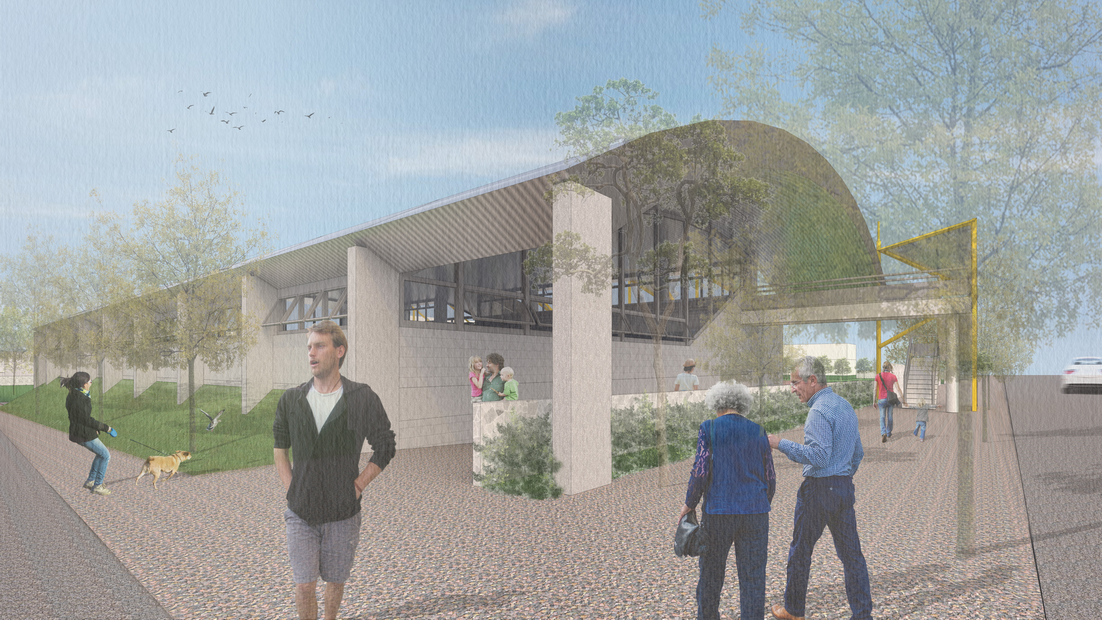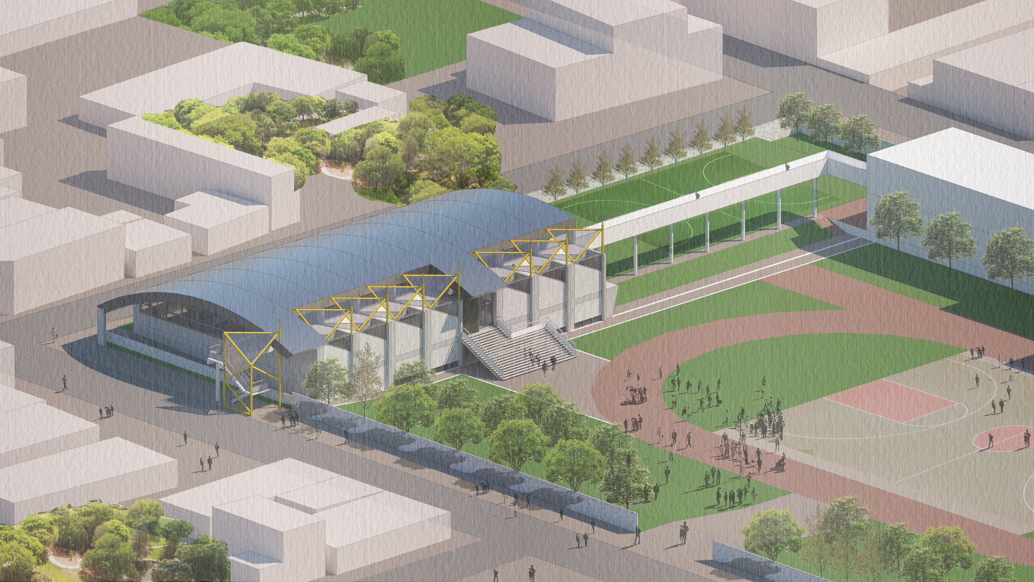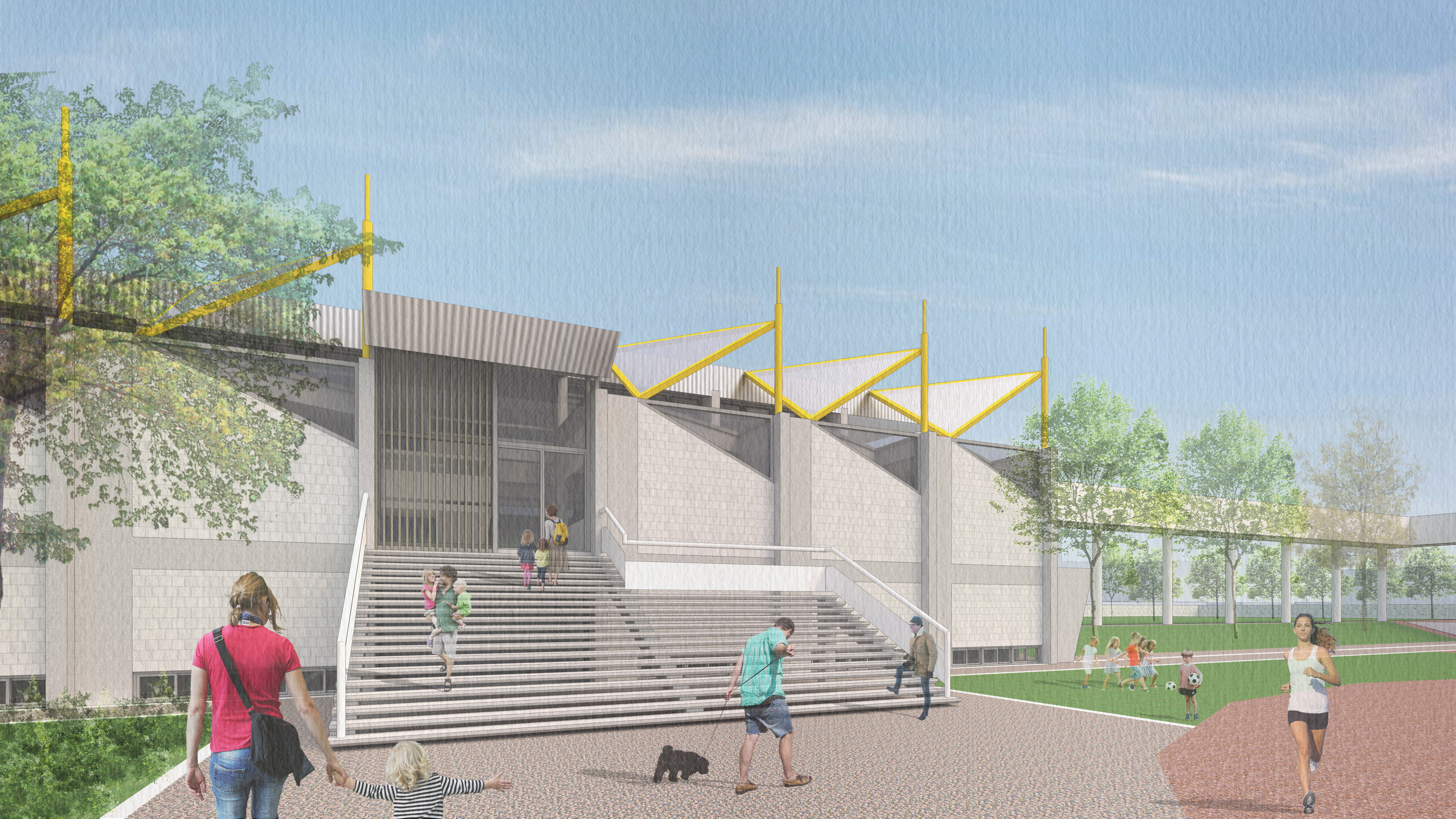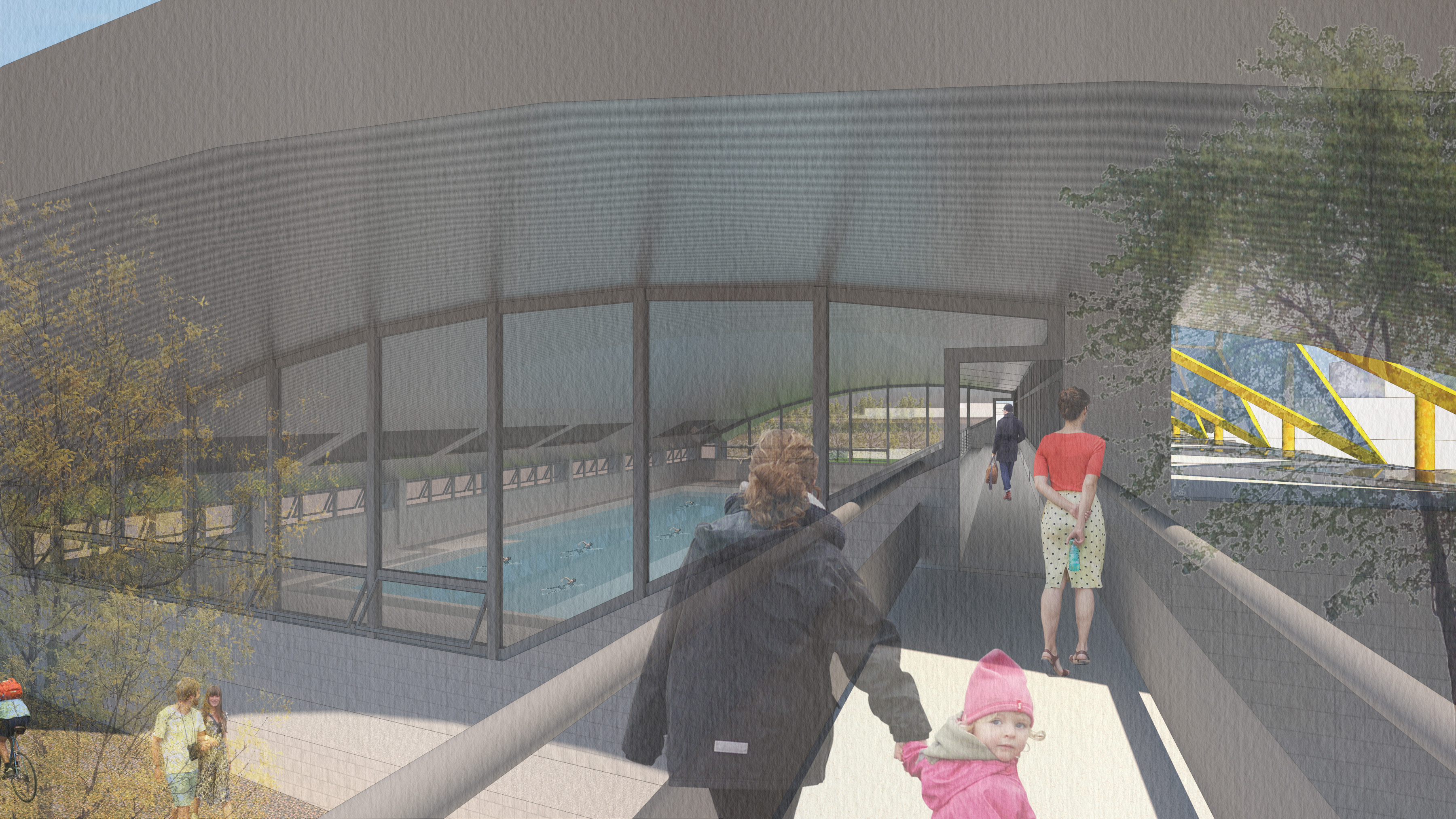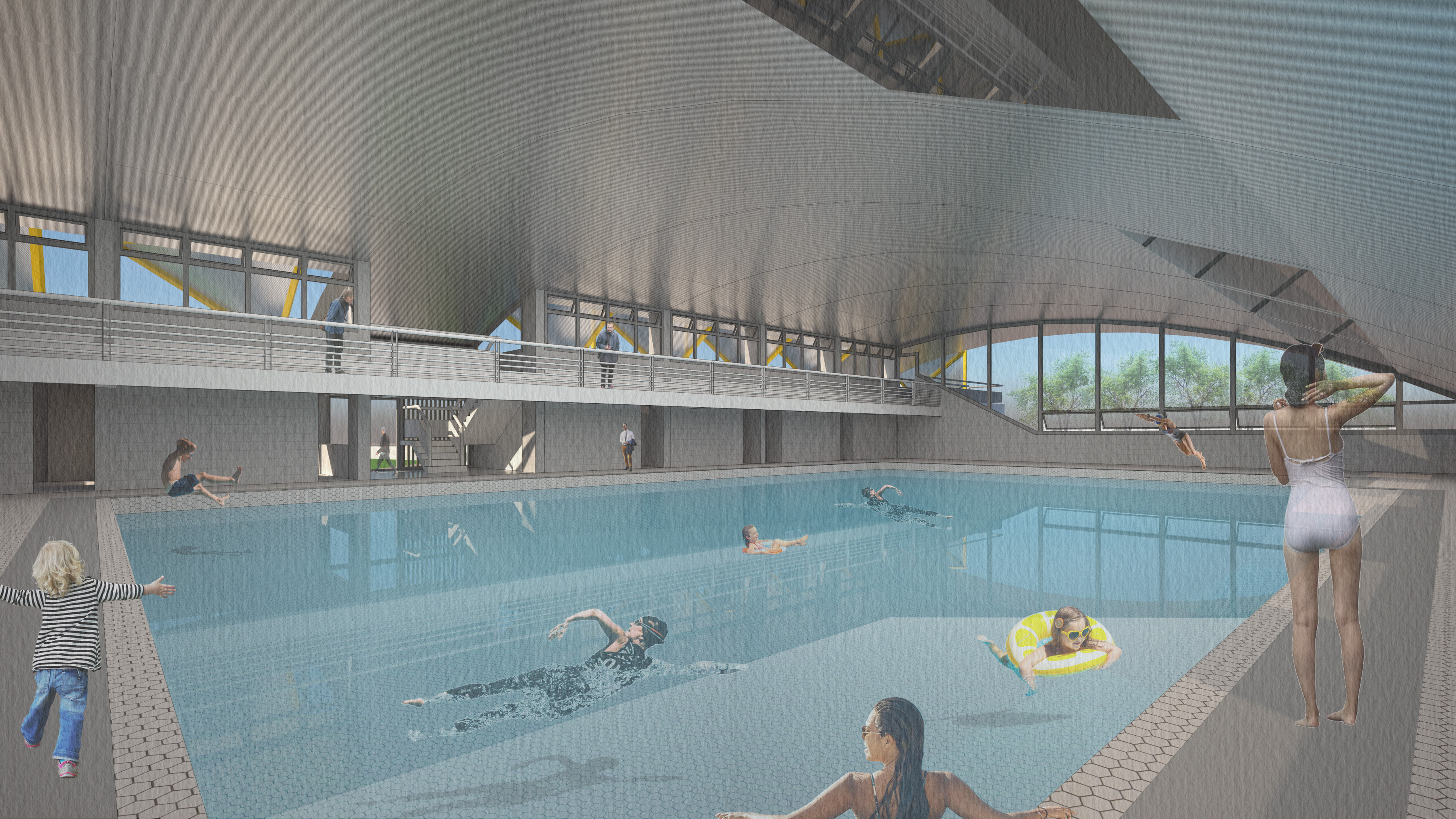 視線隨著屋頂的弧度而移動,低處側向人行道延伸,彷彿是彎下腰鞠躬迎接著居民的到來,高處側朝向運動場,結合泳池二樓更衣室採光設計,陽光從三角形頂蓋投射使空間更加明亮,同時保有機能需求的隱密,以運動場上選手的視角而望,彷彿揮著旗幟,替場上揮灑汗水、奮力奔跑的跑者大聲喝采。