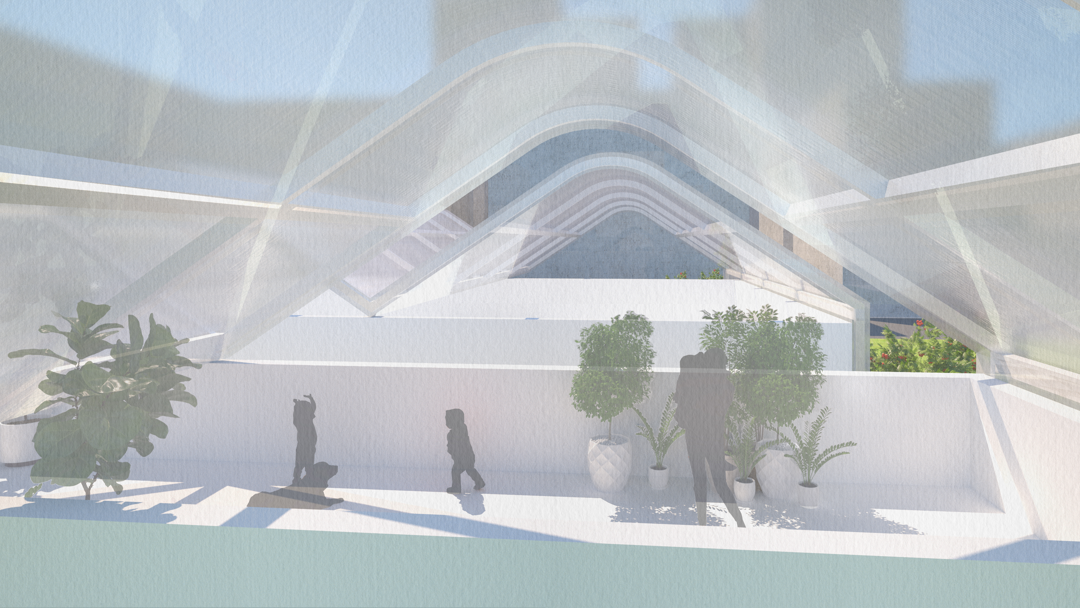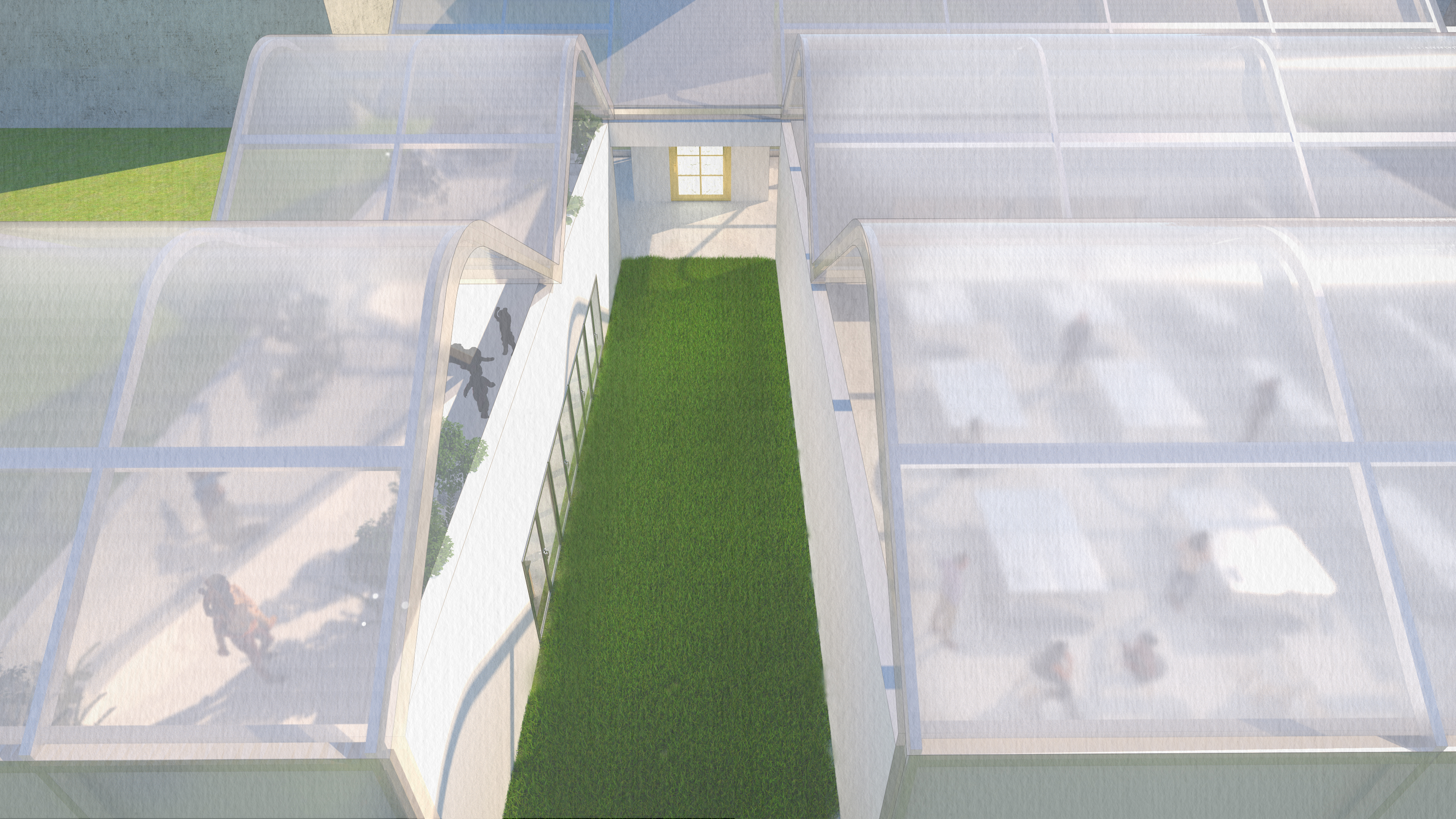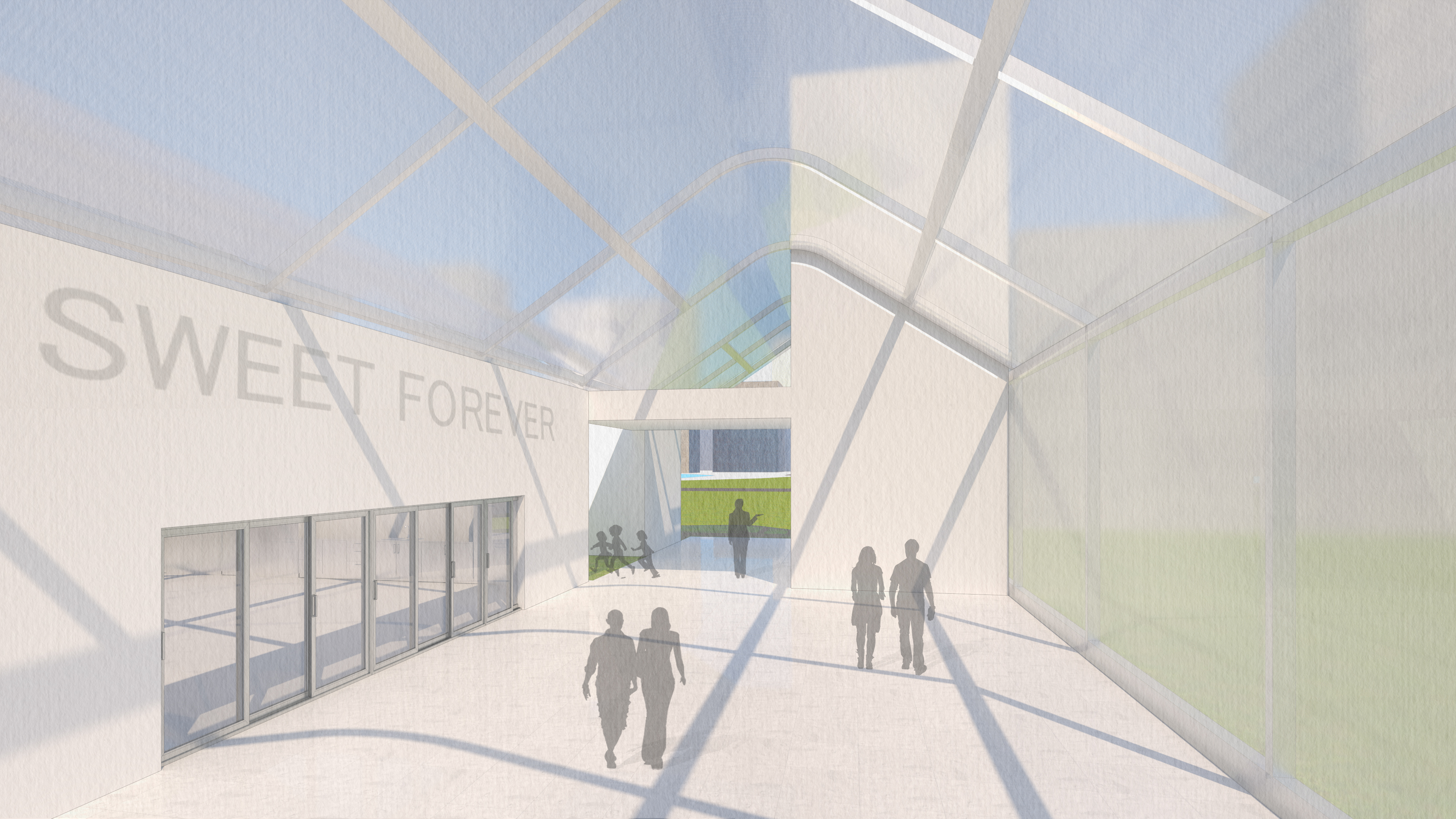 g. The use of PC boards, a semi-transparent material, allows us to see the form without the constraints of a steel frame so that the entire space image is soft and gentle as if we were in a cloud dreaming.