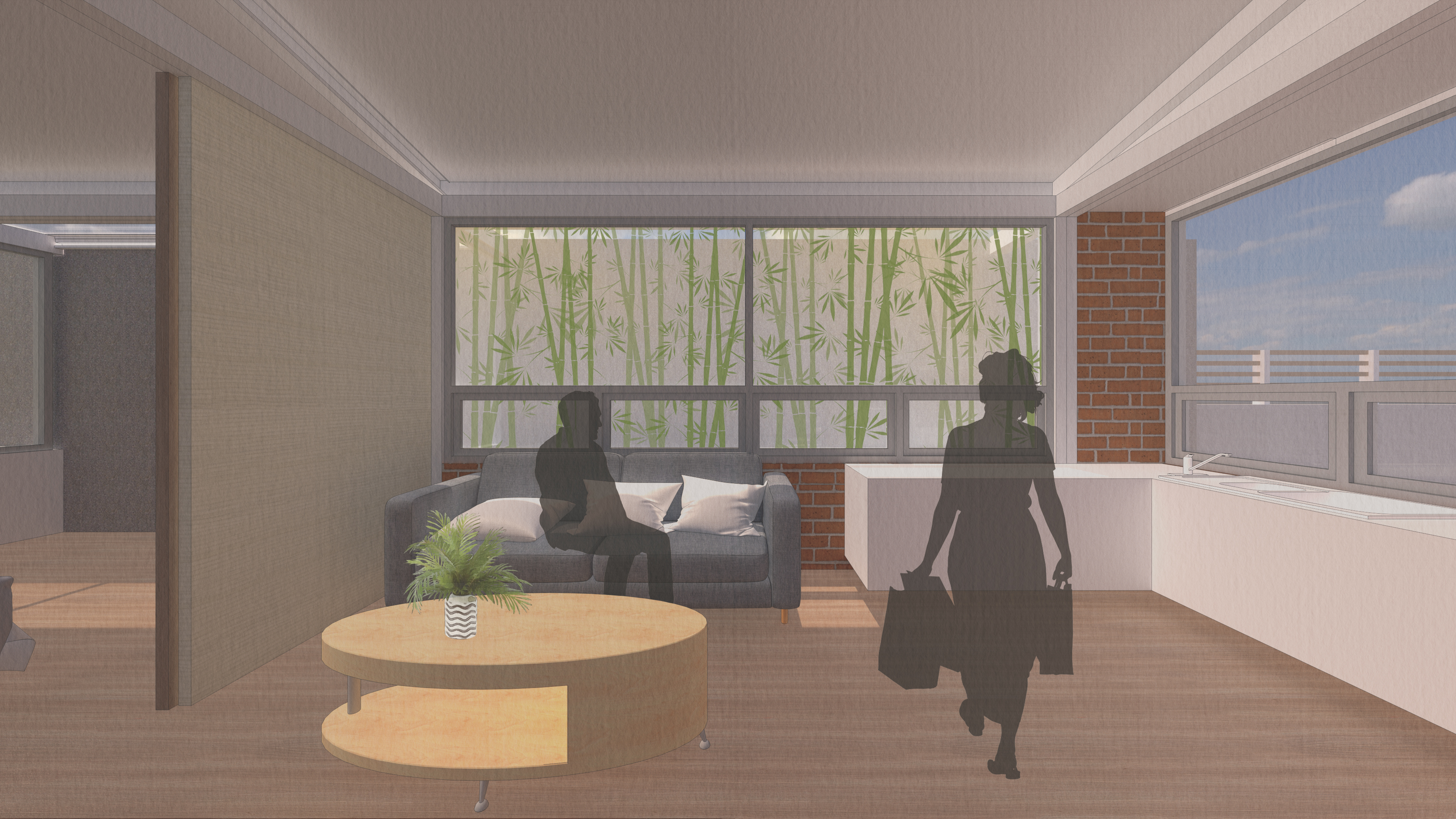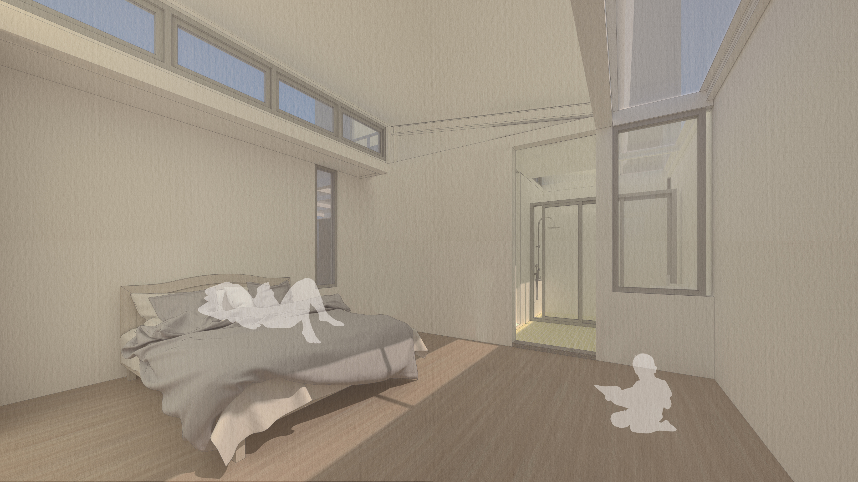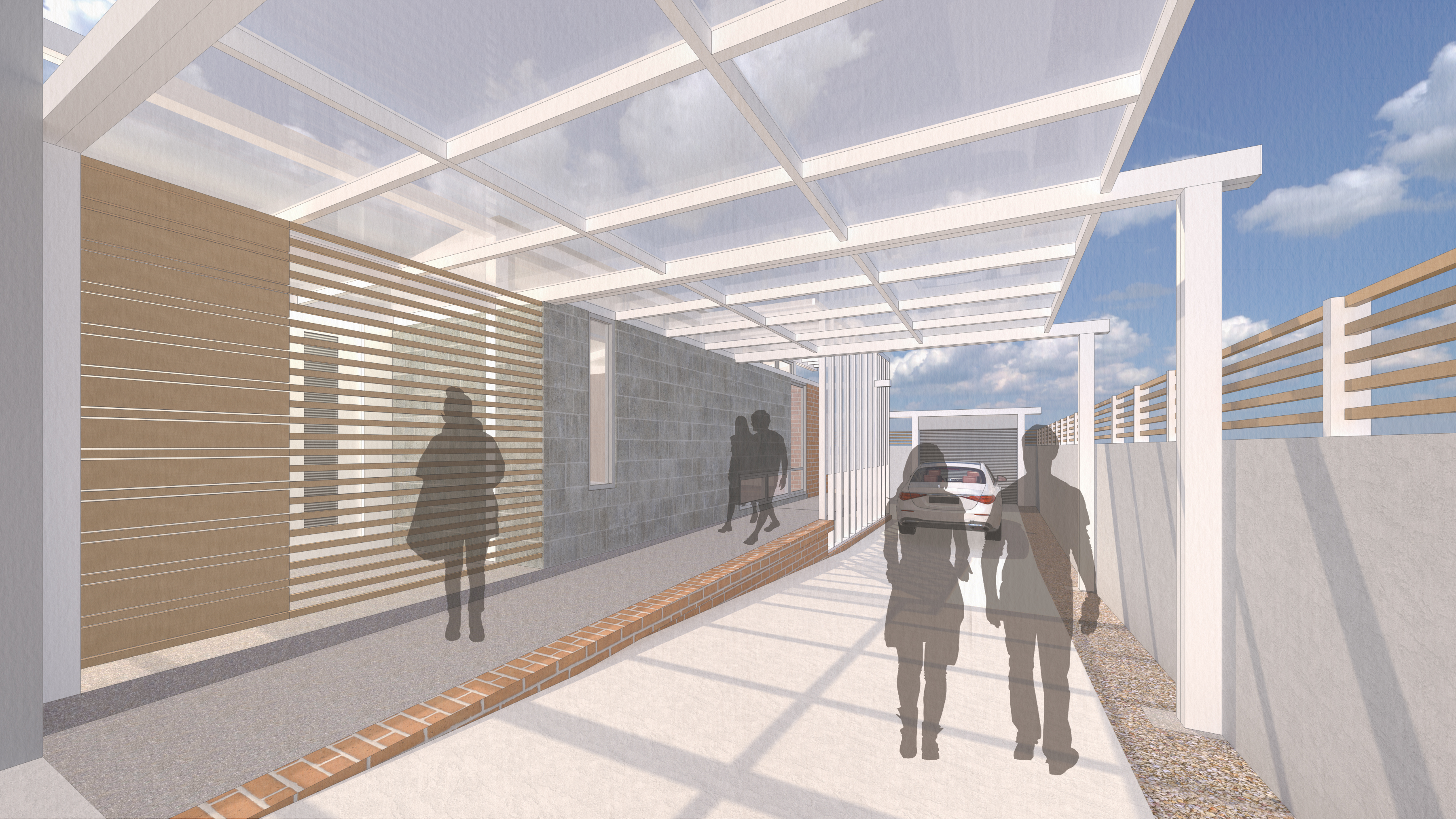 混凝土磚牆與鋼結構的支撐,梁柱的突出與延伸,形成構造的自明性,順應著地勢的起伏,建築抬升所產生的落差,無障礙坡道的環繞結合休憩機能使用,坐在格柵後方、廚房外的平台,風徐徐吹過,陽光從縫隙灑下,雙腳的騰空隨著心情不由自主地擺動,這舒適的溫度與自然因子的陪伴,是家人間茶餘飯後培養情感的最佳場所。圍牆與建築退縮的空間有綠的植入,光線投射於樹冠上,在葉片中漫射最終投射在那堵高牆上,在最外側的客廳與廚房透過大面玻璃窗望著窗外的光影隨著風變化,臥室位於中央天窗的採光手法,隨著日出日落的時間軸感受不同照度的氛圍,一旁的浴廁採用高窗通風,坐落於一樓的空間,同時享有舒適與隱密的環境,緊連接著的洗曬衣間,將奶奶洗衣的日常習慣延續,以木格柵圍塑空間,引進足夠的風與光線,形成這棟替奶奶量身打造的建築。